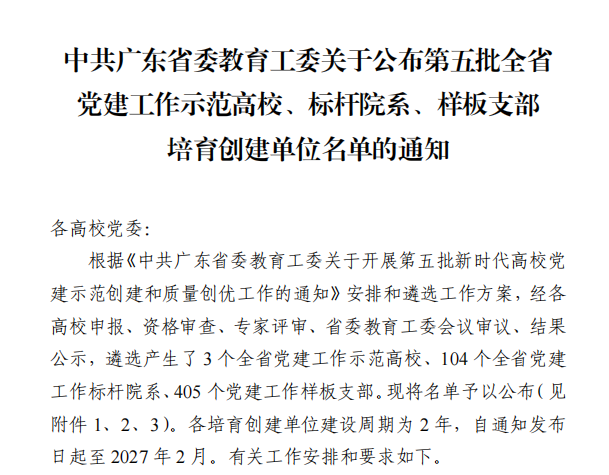 近年来,学校党委高度重视新时代高校党建示范创建和质量创优工作,并以此为推动学校党建和业务融合发展的重要抓手。截至目前,我校共有全国“党建工作样板支部”3个,全省“党建工作标杆院系”4个,全省“党建工作样板支部”11个,全省“双带头人”教师党支部书记工作室2个,全国高校“双带头人”教师党支部书记“强国行”专项行动建设单位1个、全省高校“双带头人”教师党支部书记“广东行”专项行动建设单位1个。