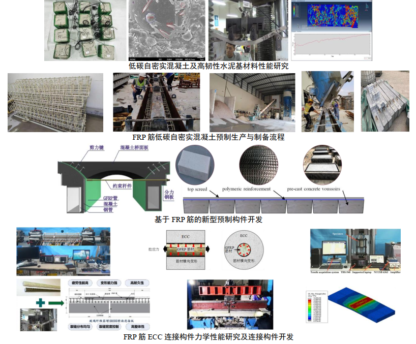 《纤维复材筋提升混凝土结构性能关键技术与应用》项目在多项国家级项目资助下,阐明FRP筋及其增强混凝土结构工作机理,构建准确的理论方法,创新FRP筋制备工艺,解决服役性态难以准确识别问题,攻克FRP筋混凝土桥面配筋率高且承载力评估不准的技术难题,自主研发出高耐久性高韧性预制构件以及加固效率显著的技术装备,形成核心技术创新成果和自主知识产权,建立一套完整且工程应用价值高的FRP筋提升混凝土结构性能技术。