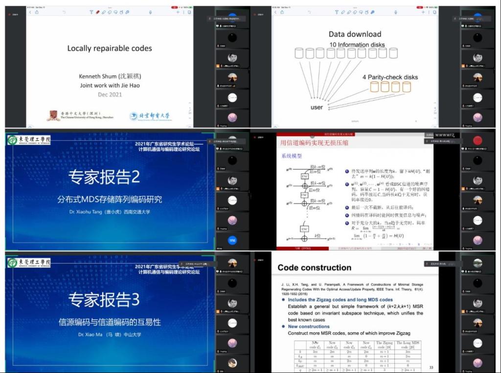 上午进行了三场精彩的专家报告,分别是来自香港中文大学(深圳)沈颖祺教授,做“局部修复编码Locally Repairable Codes”报告;西南交通大学特聘教授、国际电气与电子工程师协会(IEEE)信息论成都分会主席唐小虎教授,做“分布式MDS存储阵列编码研究”报告;以及中国电子学会信息论分会副主任委员、中山大学马啸教授,做“信源编码与信道编码的互易性”报告。报告讨论环节,师生通过留言、提问等方式与专家进行积极交流互动,现场氛围相当活跃。