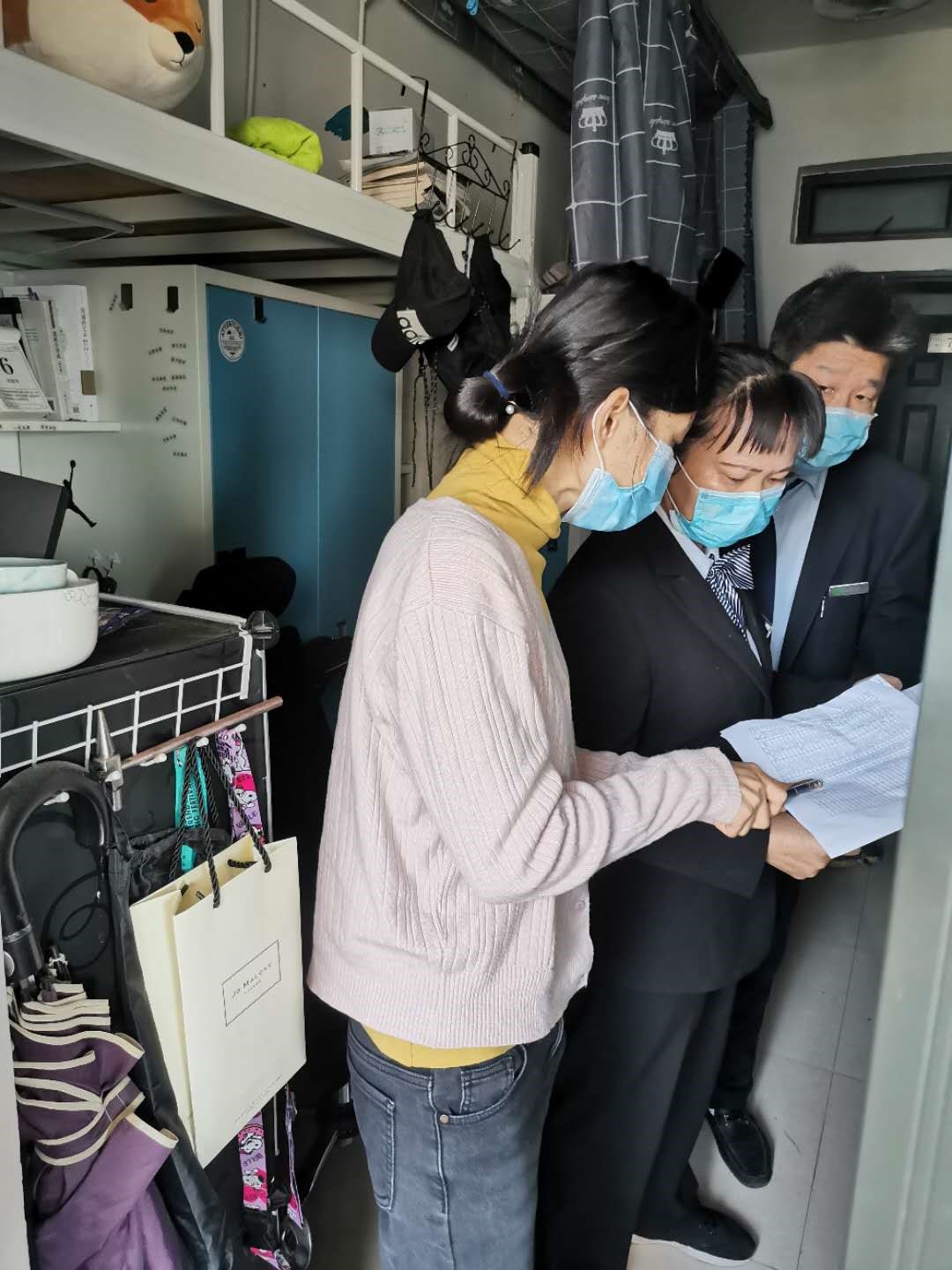 4月14日,机械工程学院辅导员黄楚刁、社工陈丹丹、官华深,社区管理人员周三英等组成联合小组,共同实地走访,检查提出查看请求的宿舍,检查过程中帮助60余间宿舍关闭宿舍电源、宿舍阳台门和清理部分残余食品,其他宿舍卫生安全情况良好。学生还可通过扫码查询检查反馈结果。